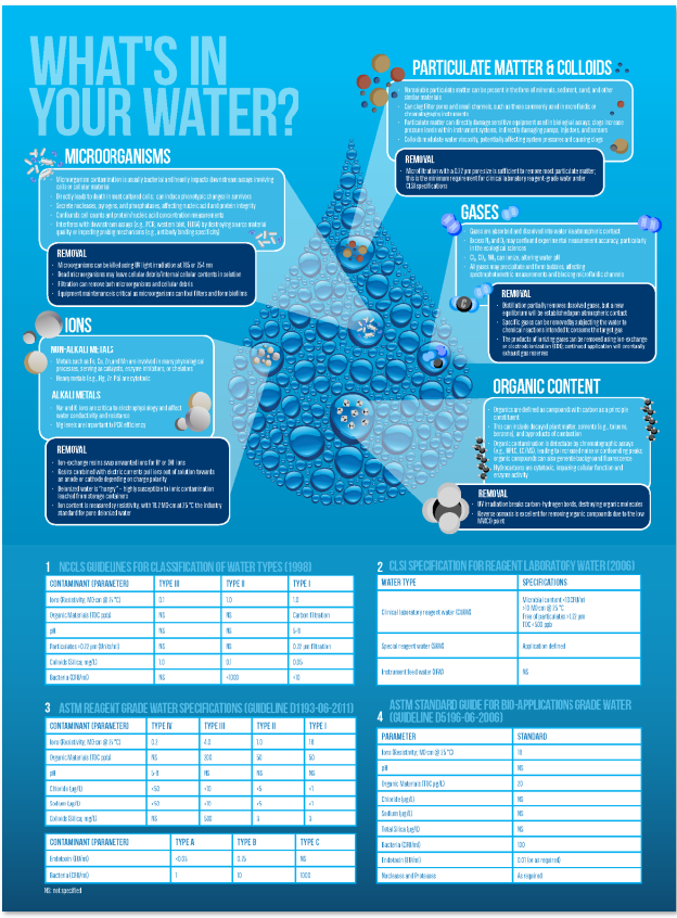 Za svakoga tko koristi vodu u laboratoriju, važno je da ju smatra kao i bilo kojim drugim reagensom. Kontaminacija vode bakterijama velika je prijetnja eksperimentima. Bakterije ne samo da mogu uzrokovati citotoksične učinke i na kultivirane i na primarne stanice, već u vodu izlučuju različita sredstva, ugrožavajući downstream mjerenja koncentracije, ometajući funkciju antitijela i negativno utječući na integritet nukleinske kiseline. Uzroci onečišćenja vode mogu se podijeliti na anorganske (plinovi, ioni otopljeni u vodi, netopive čestice i koloidi) i organske izvore (metabolički proizvodi i sintetički spojevi koji sadrže ugljik i mikroorganizme) koji mogu drastično promijeniti biološko i kemijsko ponašanje vode. Iz tog razloga, dosljedno praćenje kvalitete vode od vitalne je važnosti za osiguravanje eksperimentalne ponovljivosti unutar i između laboratorija tijekom dana, tjedana i godina. Uspješno poduzimanje ovog pothvata zahtijeva poznavanje parametara koji se koriste za definiranje kakvoće vode i razlike između različitih razina čistoće vode.