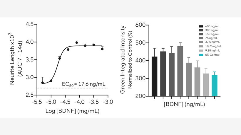 Slika 4 i 5: Kvantifikacija izrastanja neurita i ekspresije površinskih antigena stanica tijekom diferencijacije SH-SY5Y stanica. SH-SY5Y stanice diferencirane su postupnim smanjivanjem koncentracije seruma i sekvencijalnim dodavanjem retinoične kiseline i Sartorius® humanog rekombinantnog BDNF-a. Diferencijacija je provedena u prisutnosti Incucyte® Fabfluor-488 protutijela kompleksiranog s neuronskim markerom CD56 ili IgG kontrolom te Opti-Green sredstva za suzbijanje pozadinske fluorescencije. Snimke su zabilježene pomoću Incucyte® sustava za analizu živih stanica. SH-SY5Y stanice razvile su zreo neuronski fenotip unutar 14 dana (HD faza i fluorescentne slike), a kvantifikacija je pokazala da BDNF inducira učinak ovisan o koncentraciji na izrastanje neurita i ekspresiju CD56 u usporedbi s kontrolom (medij bez seruma).