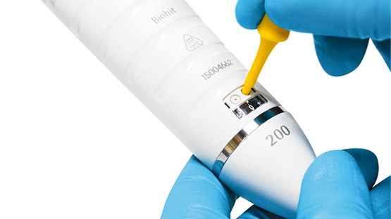 Zahvaljujući Optilock® funkciji možete zaboraviti na slučajne promjene volumena tijekom pipetiranja. Postavite i zaključajte volumen tako da jednom rukom držite tipku za zaključavanje volumena, a drugom namjestite volumen, a zatim otpustite da biste zaključali ili samo jednom rukom pomaknite zaključavanje volumena prema gore, podesite volumen i pomaknite bravu unatrag dolje. Izbor je u vašim rukama. Možete provjeriti podešeni volumen bez naprezanja očiju s velikog, lako čitljivog zaslona s četiri znamenke.