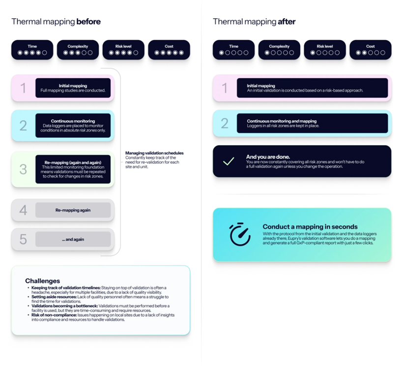 Uštedite vrijeme pomoću Eupry kompleta za mapiranje koji se jednostavno koristi s akreditiranim DANAK ISO17025 umjeravanjem i 21 CFR PART 11. Mapiranje temperature rashladne opreme važan je proces pri ispitivanju radi li vaša oprema ispravno.