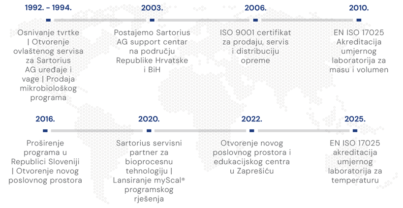 Od samih početaka rada, naša vizija je kontinuiranim radom bila prepoznata od strane kupaca, koji su nam dali povjerenje i uvjerili se u našu kvalitetu. Ubrzo nakon osnutka, 1994. godine, sav trud, znanje i sposobnost koje smo uložili u poslovanje, bili su nagrađeni te smo postali ovlašteni servis za uređaje i vage partnera Sartorius AG, vodećeg njemačkog proizvođača laboratorijskih proizvoda i bioprocesne tehnologije. Osim što nam je Sartorius AG dao povjerenje za servisnu djelatnost, 2000. smo započeli i s prodajom njihovog mikrobiološkog programa, u sklopu kojeg smo mogli tržištu ponuditi brojne proizvode za kontrolu kvalitete, filtraciju i mikrobiologiju.